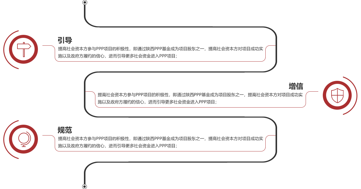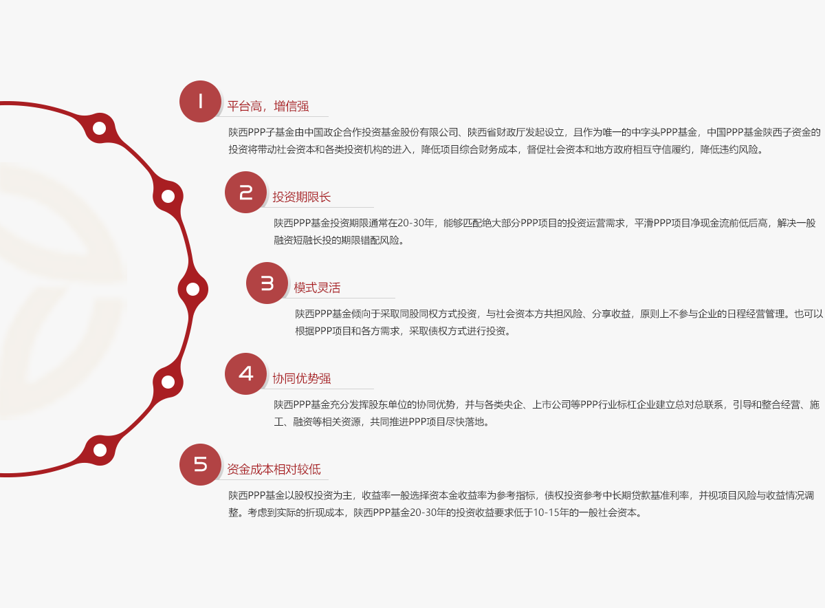 2016年3月4日,中國政企合作投資基金股份有限公司(簡稱基金公司)正式成立,注冊(cè)資本為1800億元,作為社會(huì)資本方參與PPP項(xiàng)目投資,堅(jiān)持市場化、專業(yè)化運(yùn)作,主要通過股權(quán)、債權(quán)、擔(dān)保等方式,為納入國民經(jīng)濟(jì)和社會(huì)發(fā)展規(guī)劃、基礎(chǔ)設(shè)施和公共服務(wù)領(lǐng)域?qū)m?xiàng)規(guī)劃以及黨中央、國務(wù)院確定的其他重大項(xiàng)目中的PPP項(xiàng)目提供融資支持。