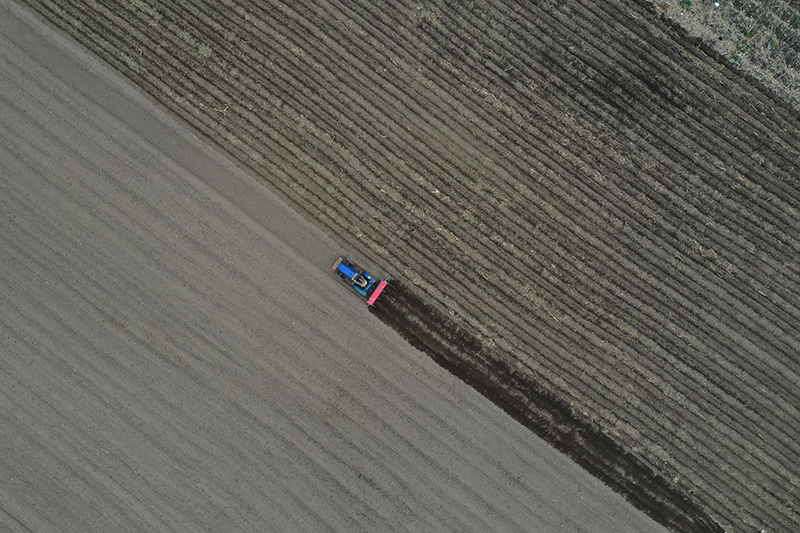 吉林省安圖縣龍山村農(nóng)民在田間播種玉米(5月8日無人機拍攝)。新華社記者 林宏 攝
