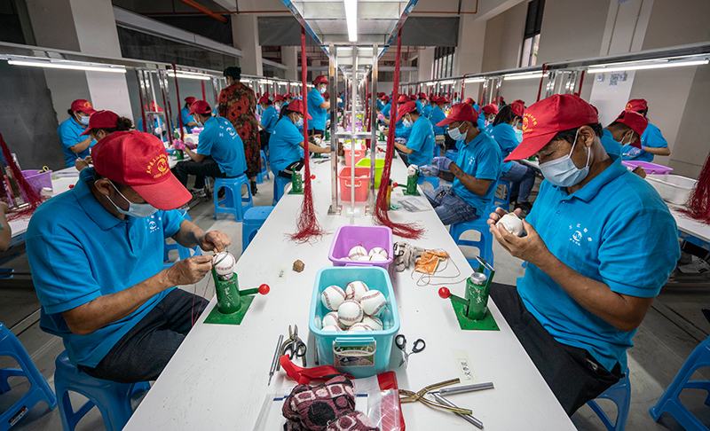 5月14日,云南省怒江傈僳族自治州怒江新城城墻壩易地扶貧安置點棒球工廠的工人在制作棒球。新華社記者 江文耀 攝