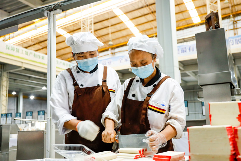 5月14日,在重慶市涪陵區(qū)美心紅酒小鎮(zhèn)景區(qū)扶貧車間里,一名技師手把手地指導(dǎo)貧困戶李曉紅(右)加工食品。為助力脫貧攻堅(jiān),美心紅酒小鎮(zhèn)景區(qū)結(jié)合自身旅游人氣優(yōu)勢(shì),將閑置廠房改造成扶貧車間。扶貧車間在采買貧困戶和周邊村民榨菜、土豆等農(nóng)副產(chǎn)品進(jìn)行消費(fèi)扶貧的同時(shí),還優(yōu)先招收困難群眾、貧困戶進(jìn)入車間從事食品加工生產(chǎn)工作,帶動(dòng)景區(qū)周邊100余戶貧困戶和困難群眾家庭實(shí)現(xiàn)增收。新華社記者 劉潺 攝