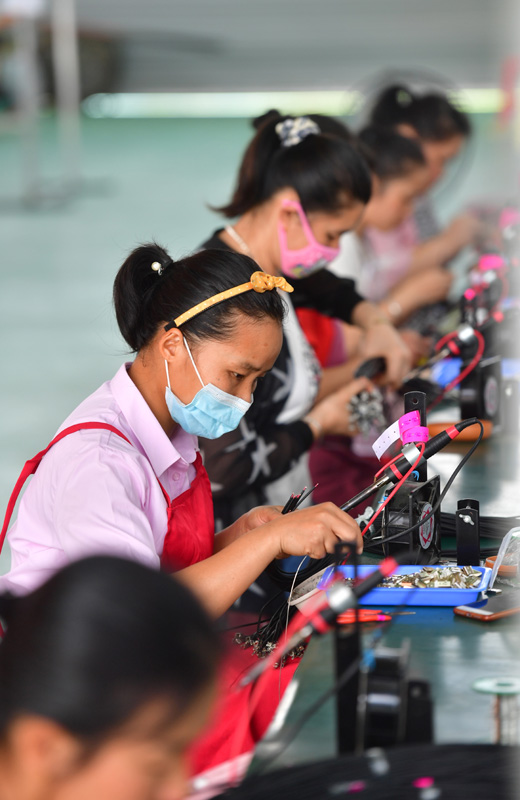 5月17日,在廣西融安縣農(nóng)產(chǎn)品加工暨粵桂扶貧協(xié)作產(chǎn)業(yè)園,一家電子產(chǎn)品企業(yè)的工人在扶貧車間生產(chǎn)線上作業(yè)。新華社記者 黃孝邦 攝