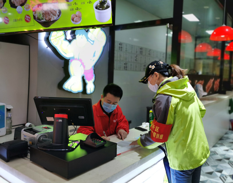 4月9日,天津市金融局下沉干部(右)在市內(nèi)一家商場(chǎng)了解中小微企業(yè)復(fù)工情況,并送去防疫物資。新華社記者 劉惟真 攝