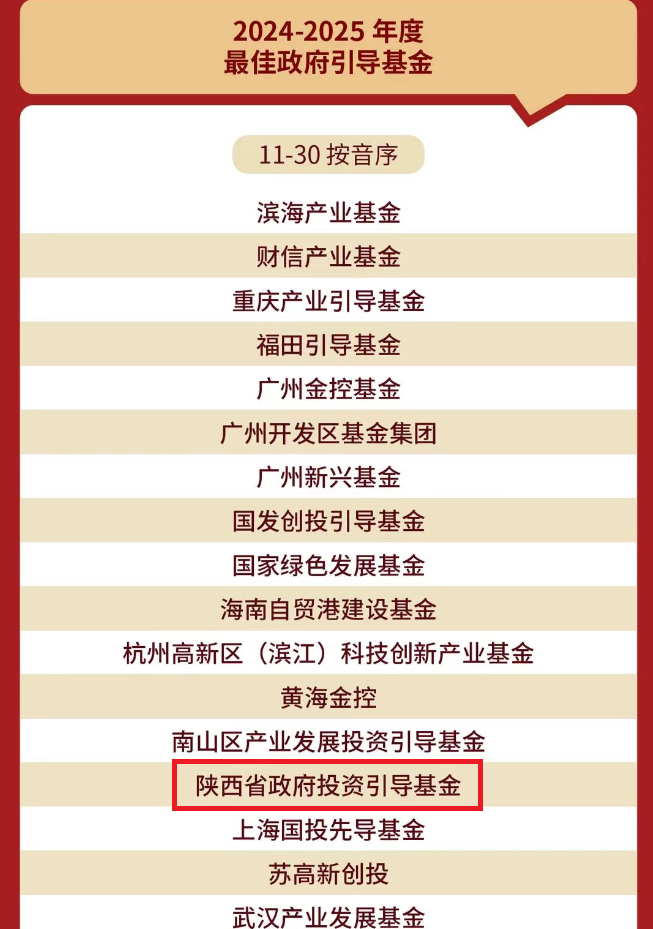 2025年7月23日,融資中國(guó)2024-2025年度有限合伙人榜單盛大發(fā)布,陜西省政府投資引導(dǎo)基金(以下簡(jiǎn)稱“引導(dǎo)基金”)榮獲“2024—2025年度最佳政府引導(dǎo)基金TOP30”、“2024—2025年度最佳省級(jí)政府引導(dǎo)基金TOP20”。這是引導(dǎo)基金連續(xù)4年獲此榜單殊榮,并今年首次入圍省級(jí)20強(qiáng)!