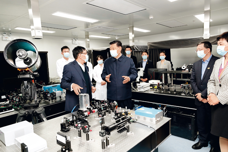 2021年4月19日,在清華大學(xué)建校110周年校慶日即將來臨之際,中共中央總書記、國家主席、中央軍委主席習(xí)近平來到清華大學(xué)考察。這是習(xí)近平在清華大學(xué)成像與智能技術(shù)實驗室同師生們親切交談。 新華社記者 黃敬文/攝