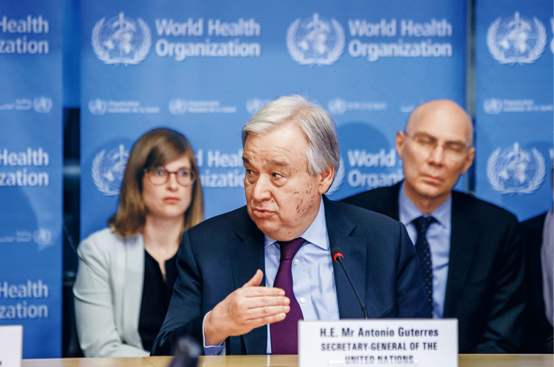 2020年2月24日,聯(lián)合國秘書長古特雷斯(前)在瑞士日內(nèi)瓦世界衛(wèi)生組織總部發(fā)表講話。古特雷斯表示,中國實施嚴格的防控措施,以犧牲正常生活的方式為全人類作出了貢獻。古特雷斯當日造訪日內(nèi)瓦世衛(wèi)組織總部,并與世衛(wèi)組織各部門負責人舉行座談。 新華社發(fā)